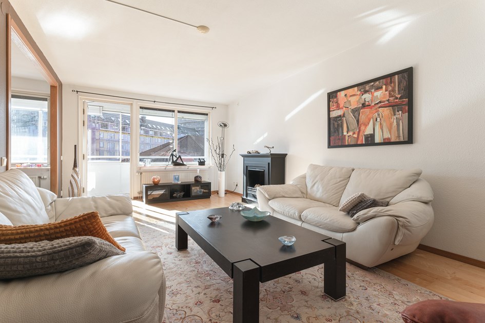 Ljust och rymligt vardagsrum med utgång till balkongen