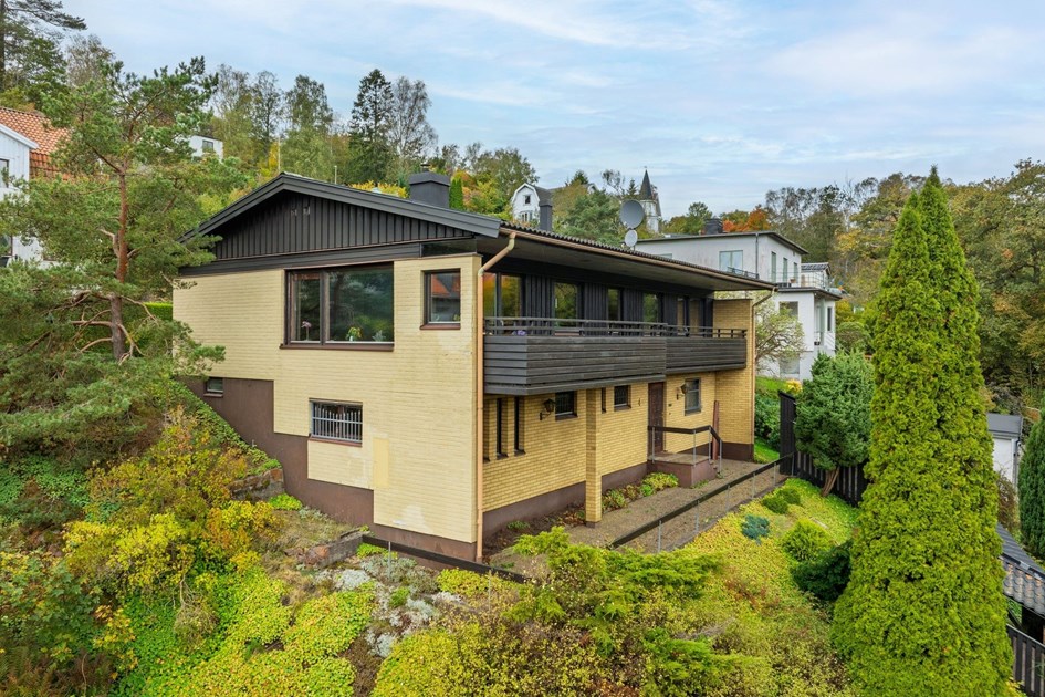 Den stora tomten erbjuder många möjligheter för härliga stunder i solen och lek för de små. Villans framsida som har en stensatt uteplats har en hänförande utsikt över Toltorpsdalen. På baksidan finns en plan gräsmatta som har eftermiddagssol och kvällssol under sommarhalvåret. Nedanför villan finns garage och parkeringsplats.