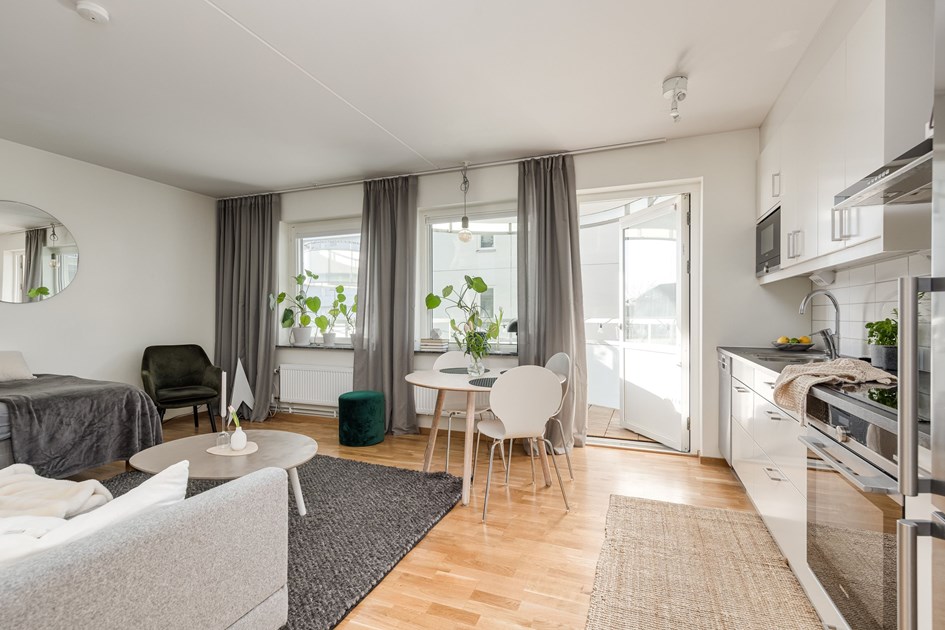 Balkongen i sydvästläge blir snabbt din favoritplats under sommarhalvåret. Med sina generösa ytor finns det gott om plats för både bekväma loungemöbler och vackra blomsterarrangemang. Här kan du njuta av långa eftermiddagar och ljusa kvällar. Vardagsrummet är perfekt planerat i form och storlek och erbjuder plats för soffa med soffbord. För dig som vill skapa en mer privat sovalkov finns goda möjligheter att skärma av med en stilren vägg eller en gardinskena i taket. Bostadens badrum är en plats för avkoppling, smakfullt inrett med ljusa kaklade väggar och ett behagligt klinkergolv med golvvärme. Den stilrena inredningen från Vedum innefattar ett tvättställ med tillhörande kommod och ett praktiskt spegelskåp med integrerad belysning. I taket sprider spotlights ett behagligt ljus och för en smidigare vardag finns en effektiv kombimaskin från Siemens installerad.