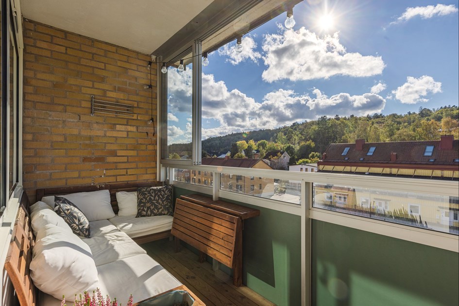Välkommen till en ljus och trevlig lägenhet högst upp i huset med utsikt över både grönska och takåsar. Charmigt kök med kyl/frys, spis med fläkt ovanför och diskmaskin smart placerad bakom lucka i högskåp. Matplats vid fönster. Vardagsrummet är rymligt och erbjuder plats för både soffgrupp och matsalsdel. Från vardagsrummet kommer du ut på en härlig inglasad balkong i bästa sydväst läge. Det stora sovrummet med insynsskyddat läge har plats för dubbelsäng och längs med ena väggen finns flera garderober. Badrummet är helkaklat med klinkergolv och för dig som gillar ett avkopplande varmt bad är badkaret ett plus. Från hallen når du bostadens alla rum och här finns två garderober och plats för byråer eller sittmöbel. Utöver bostadens alla garderober finns två externa förråd i källaren.